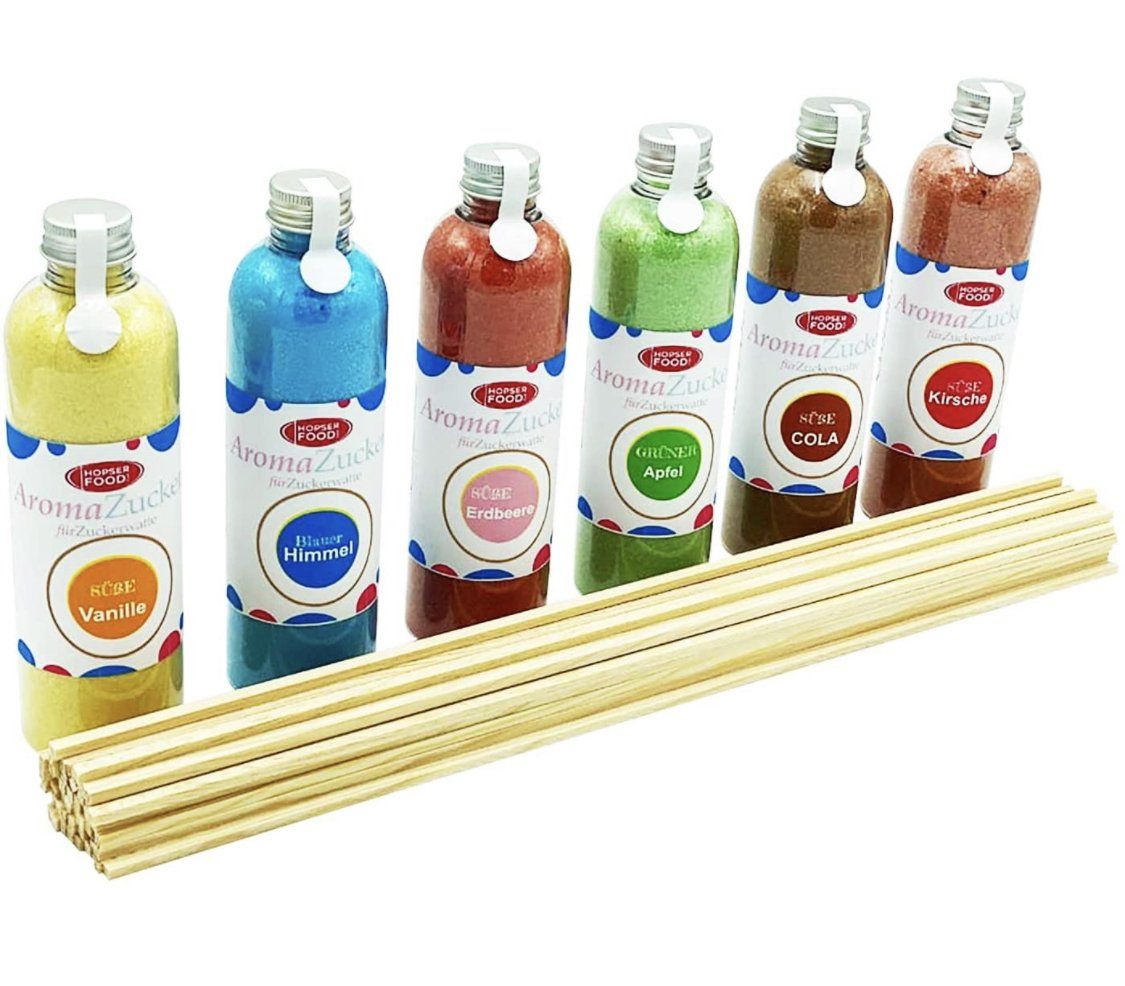 Set bestehend aus 50 Hölzern und 4 verschiedenen farbigen Aromazuckersorten (z.B. rosa(Bubble GUM),rot (Erdbeere),blau (Heidelbeere), rot (Kirsche)